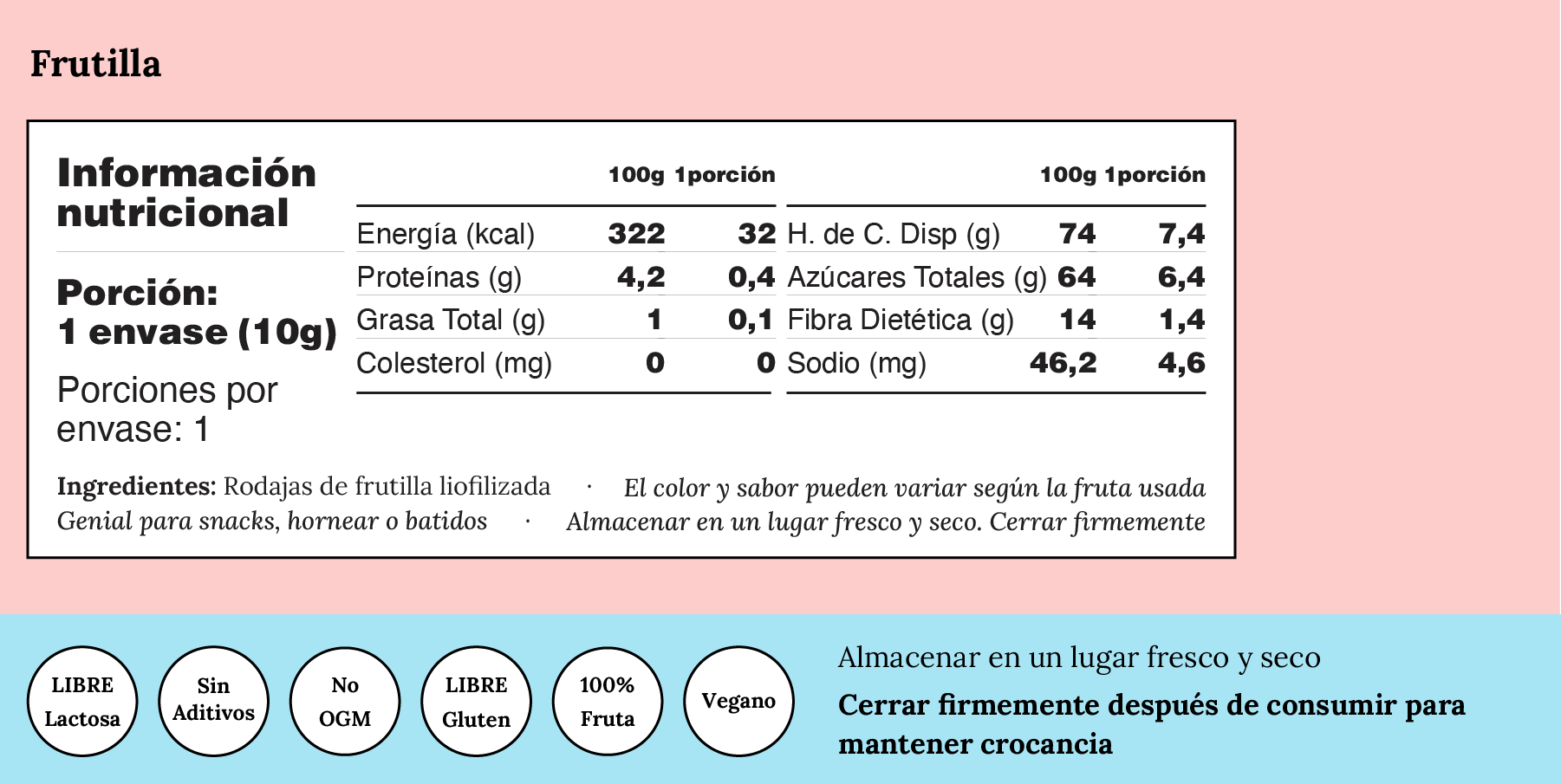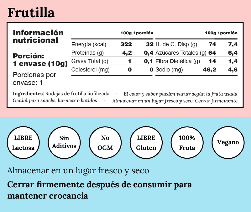 Eleva tus snacks con el sabor natural y crujiente de las cerezas enteras liofilizadas. Este formato familiar resellable de 181 gramos te permite disfrutar de una delicia saludable y ligera en cualquier momento. Si n azúcar añadida ni aditivos, y libre de gluten, estas cerezas mantienen el 98% de sus nutrientes y vitaminas, haciendo de cada bocado una fuente de energía natural. Perfectas para un antojo rápido, añadir a yogures o cereales, o simplemente disfrutar como están. ¡Un snack premium para compartir con la familia o disfrutar solo!
